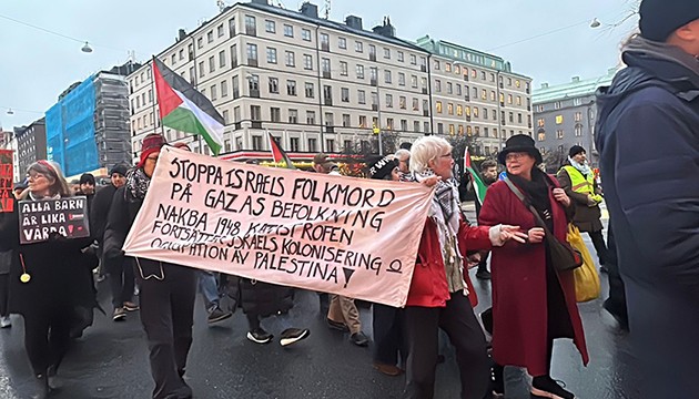 "Sivilleri bombalamak meşru müdafaa değil. Soykırıma hayır de", "Kurtuluşa erişene kadar direniş", "Filistin için ayağa kalkın", "Gıda kısıtlamasına son verilsin" ve "İsrail barış anlaşmasına uysun" yazılı dövizler taşıyan göstericiler, İsveç hükümetini İsrail'e karşı kapsamlı askeri ambargo uygulamaya davet etti.