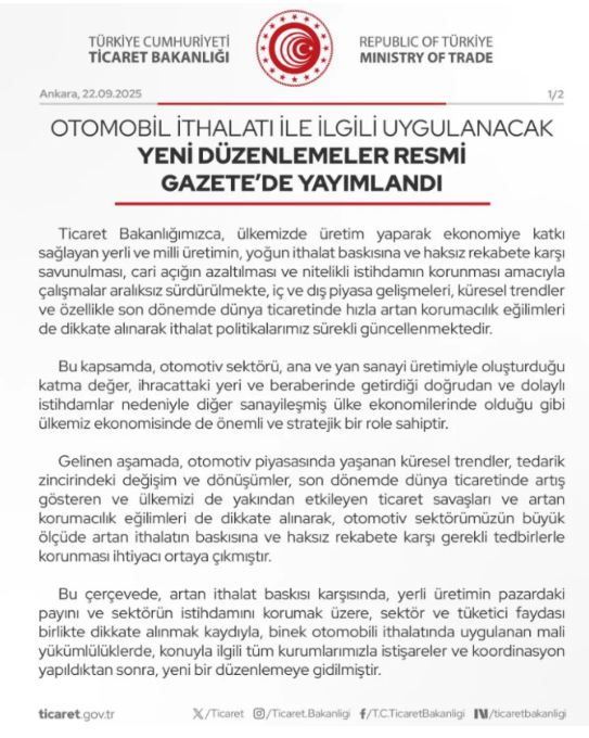 "Düzenlemeye konu olan araçların ithalatında, başlamış işlemler için bir geçiş süreci de sağlanmış olup, Karar hükümleri, yayımı tarihini takip eden altmışıncı gün yürürlüğe girecektir. Ticaret Bakanlığımız, ilgili kurumlarla istişare içerisinde, üretici ve tüketici faydasını ve otomotiv piyasasındaki küresel eğilimleri de dikkate alarak, gelişmiş ülke ekonomileri ve sanayileşmiş tüm ülkeler için stratejik konumda bulunan otomotiv sektörüne dair yeni politikalar üretmeye, yerli üretimin, istihdamın ve ihracatın geliştirilmesi için gerekli adımları kararlılıkla atmaya devam edecektir"
