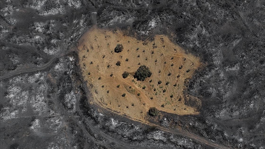 İzmir'in Ödemiş ilçesinde çıkan orman yangınında, çiftçi Ahmet Türk'ün daha önceden sürüp otlardan temizlediği bahçe, siyah örtüyle kaplanan bölgede yanmamış olmasıyla dikkati çekiyor.