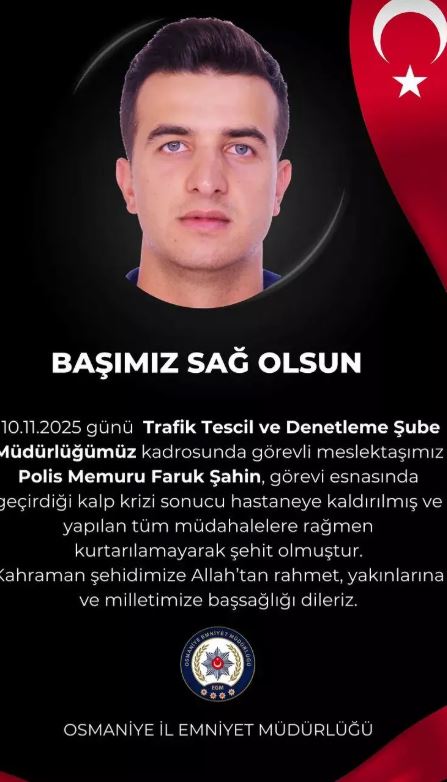 Osmaniye İl Emniyet Müdürlüğü tarafından paylaşılan başsağlığı mesajında, “10 Kasım günü Trafik Tescil ve Denetleme Şube Müdürlüğümüz kadrosunda görevli meslektaşımız polis memuru Faruk Şahin, görevi esnasında geçirdiği kalp krizi sonucu hastaneye kaldırılmış ve yapılan tüm müdahalelere rağmen kurtarılamayarak şehit olmuştur. Kahraman şehidimize Allah'tan rahmet, yakınlarına ve milletimize başsağlığı dileriz” denildi.
