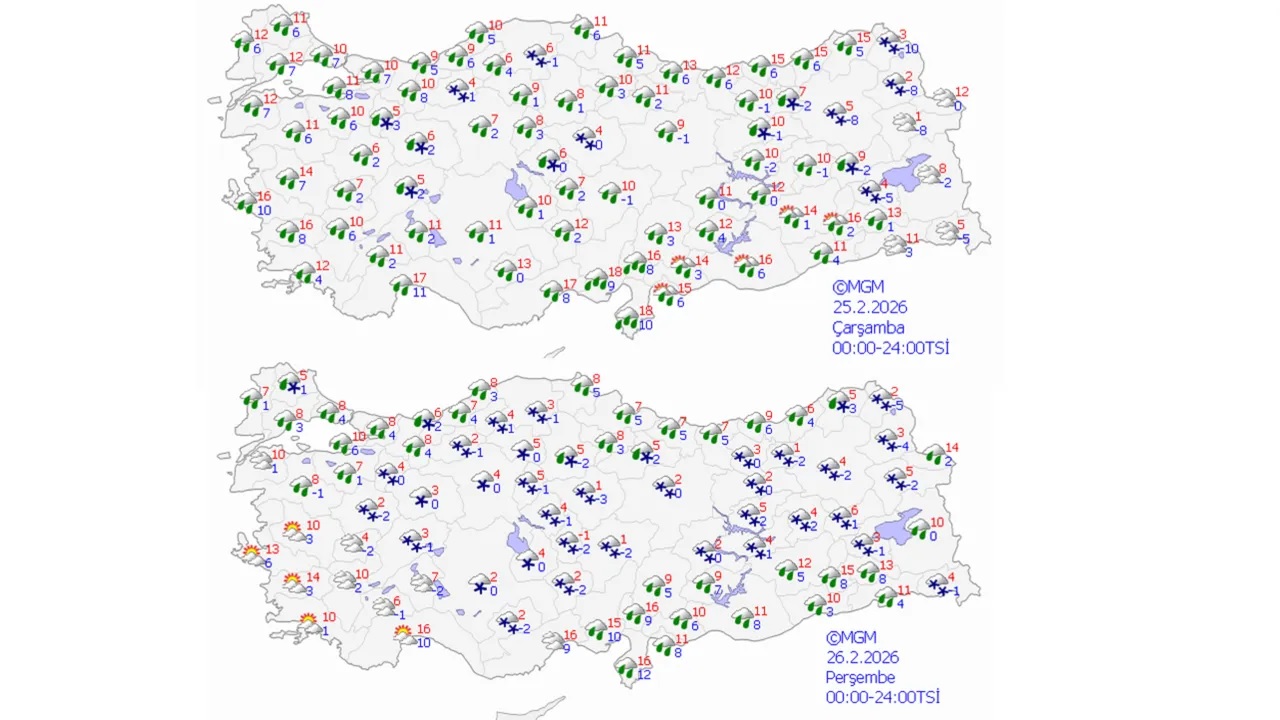 Hafta başında parçalı bulutlu ve sağanak yağışlı seyreden hava durumu, çarşamba günü yerini kar yağışına bırakacak. Özellikle Ankara, Eskişehir, Konya ve Kayseri gibi İç Anadolu illeri ile Doğu Anadolu’nun tamamında karla karışık yağmur ve kar bekleniyor. Meteoroloji’nin 5 günlük tahmin raporuna göre, cuma günü sıcaklıkların ülke genelinde mevsim normallerinin altına inmesiyle birlikte kış şartları en sert haliyle hissedilecek.