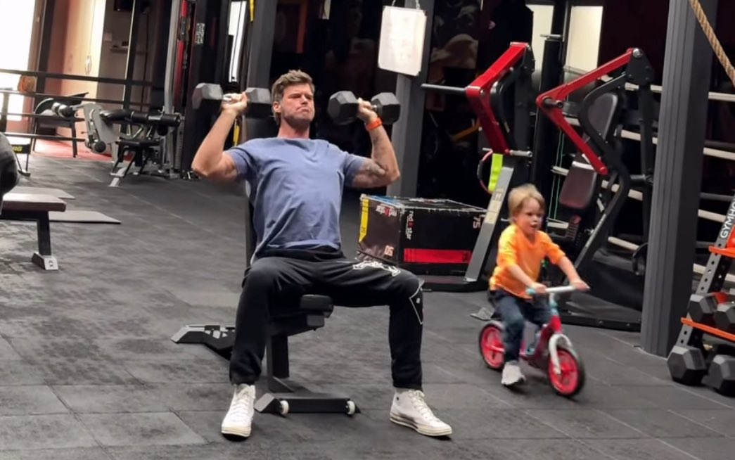 Tatlıtuğ ağırlık kaldırırken babasına benzerliği ile dikkat çeken Kurt Efe ise salonda bisiklete bindi.