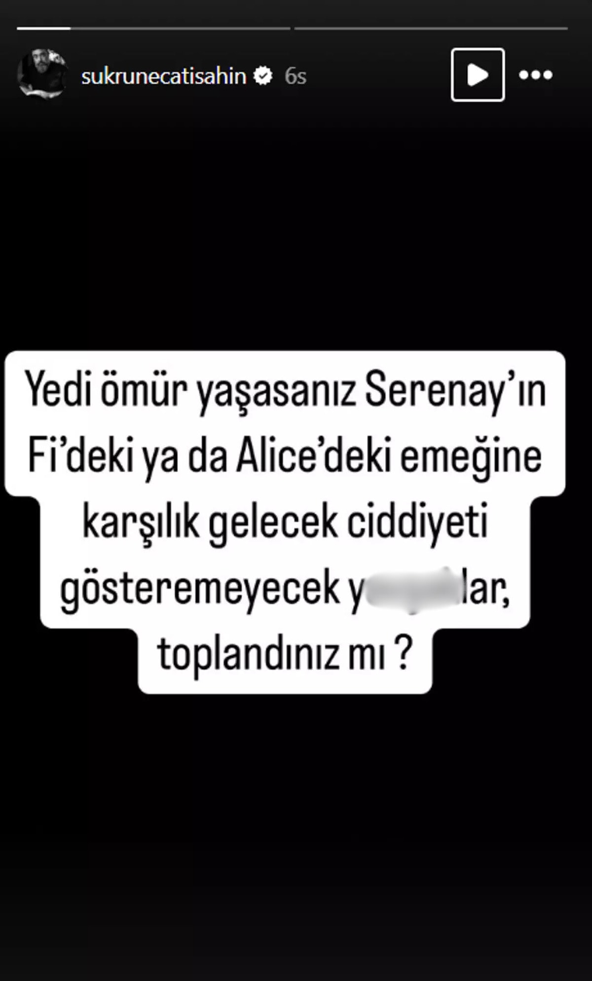 Şahin, "Yedi ömür yaşasanız Serenay'ın Fi'deki ya da Alice'deki emeğine karşılık gelecek ciddiyeti gösteremeyecek y**şaklar toplandınız mı?" dedi.