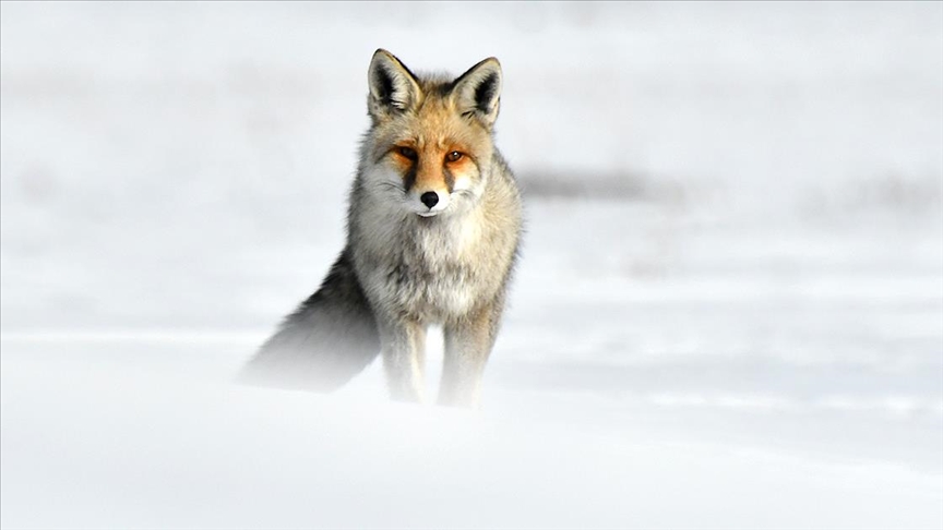 Kar ve soğuk hava nedeniyle yaban hayatının olumsuz etkilendiği bölgede, kızıl tilkiler, dakikalarca sesleri dinleyerek avını yakalamaya çalışıyor.