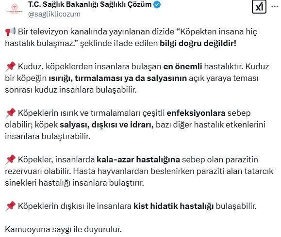 Sahnenin ardından Sağlık Bakanlığı, Sağlıklı Çözüm hesabından bir uyarı metni yayınladı. Açıklamada, "Köpekten insana hastalık bulaşmaz" şeklindeki bilginin doğru olmadığı belirtildi. Açıklamada şu ifadelere yer verildi: "Bir televizyon kanalında yayınlanan dizide "Köpekten insana hiç hastalık bulaşmaz." şeklinde ifade edilen bilgi doğru değildir!