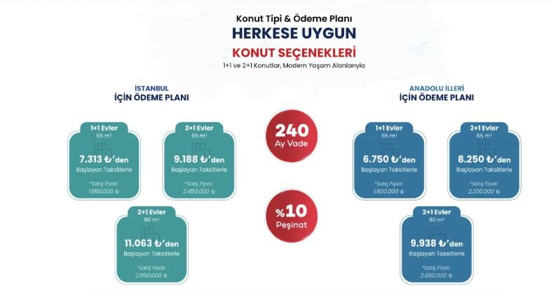Konutların fiyatı ve taksit tutarları İstanbul ve Anadolu illerinde farklı olacak.