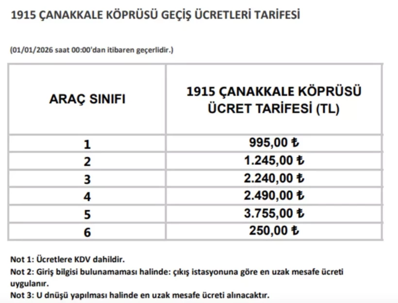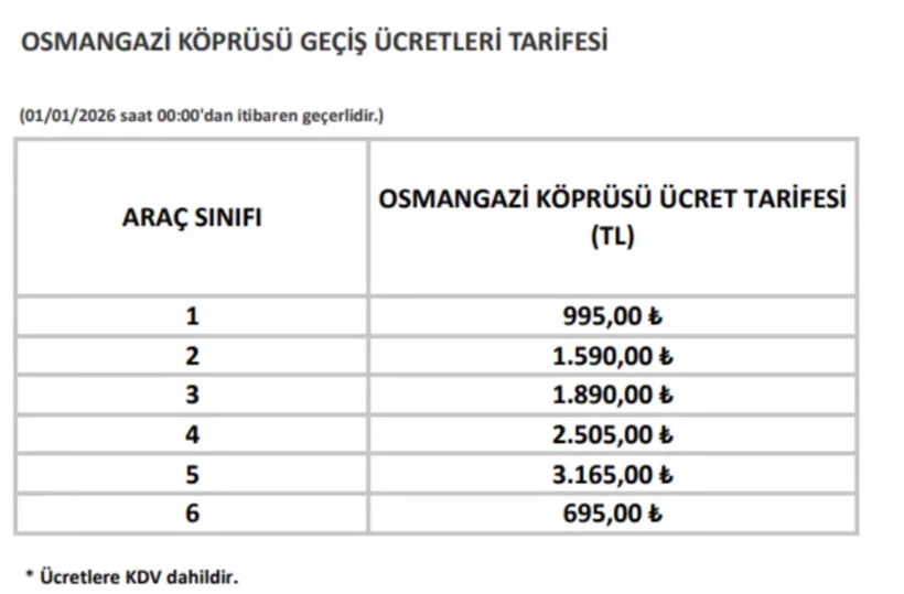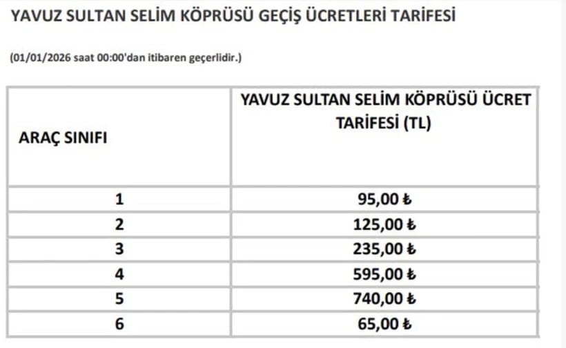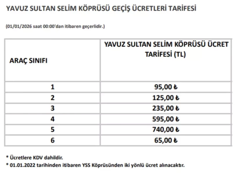Karayolları Genel Müdürlüğünce ve Kamu Özel İşbirliği (KÖİ) ile özel şirketler tarafından işletilen yol ve köprülerin geçiş ücretleri 1 Ocak 2026 Perşembe günü sat 00.00'dan itibaren geçerli olacak şekilde zamlandı.