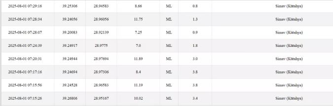 Afet ve Acil Durum Yönetimi Başkanlığı (AFAD), Kütahya'nın Simav ilçesinde 5 dakika arayla peş peşe dört deprem meydana geldi.