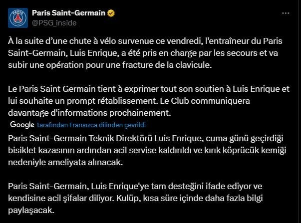 Fransız devi tarafından yapılan açıklamada, "Paris Saint-Germain Teknik Direktörü Luis Enrique, cuma günü geçirdiği bisiklet kazasının ardından acil servise kaldırıldı ve kırık köprücük kemiği nedeniyle ameliyata alınacak. Paris Saint-Germain, Luis Enrique'ye tam desteğini ifade ediyor ve kendisine acil şifalar diliyor. Kulüp, kısa süre içinde daha fazla bilgi paylaşacak" ifadelerine yer verildi.