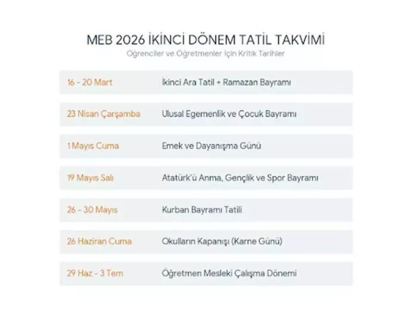 Açıklanan takvimle birlikte ikinci döneme ilişkin tüm tatil ve çalışma günleri netleşmiş oldu.