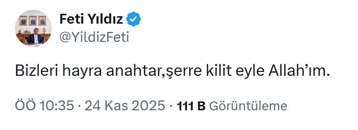 Yıldız, X hesabından "Bizleri hayra anahtar, şerre kilit eyle Allah’ım." ifadeleriyle dua etti.