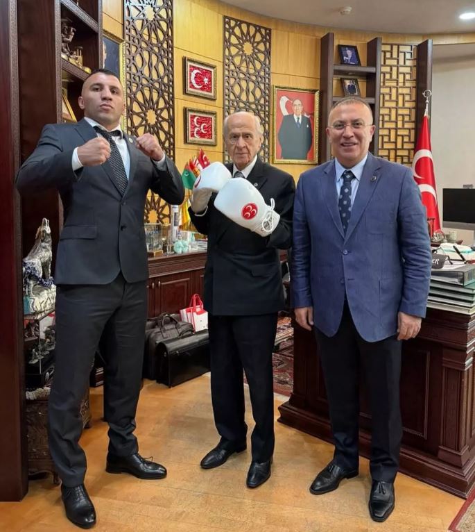 Ziyaretin ardından MHP lideri Bahçeli, üzerinde 3 hilal bulunan boks eldivenleri ile poz verdi.