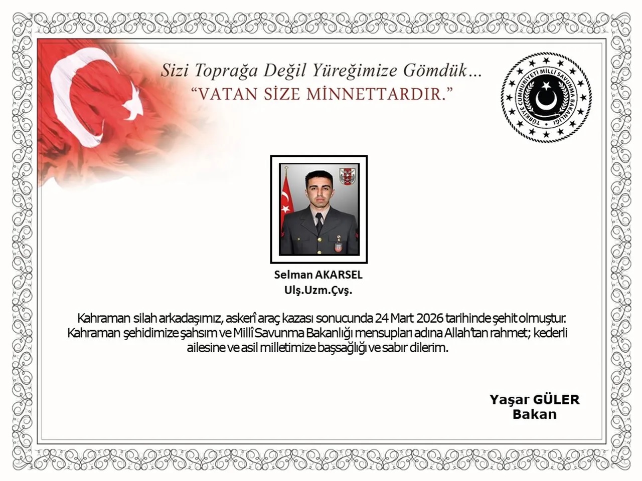 24 Mart 2026 tarihinde Ağrı’nın Doğubayazıt bölgesinde intikal halindeki bir askeri aracın kaza yapması sonucu ağır yaralanan Ulaştırma Uzman Çavuş Selman Akarsel, acil olarak hastaneye kaldırılmıştı. MSB’den yapılan son açıklamada, kahraman askerin hayata tutunma mücadelesini kaybettiği duyuruldu. Bakanlık açıklamasında, "Bizleri derin bir acı ve üzüntüye boğan bu olayda hayatını kaybeden aziz şehidimize Allah’tan rahmet; kederli ailesine, Türk Silahlı Kuvvetleri ile asil milletimize başsağlığı ve sabır dileriz" ifadelerine yer verildi.