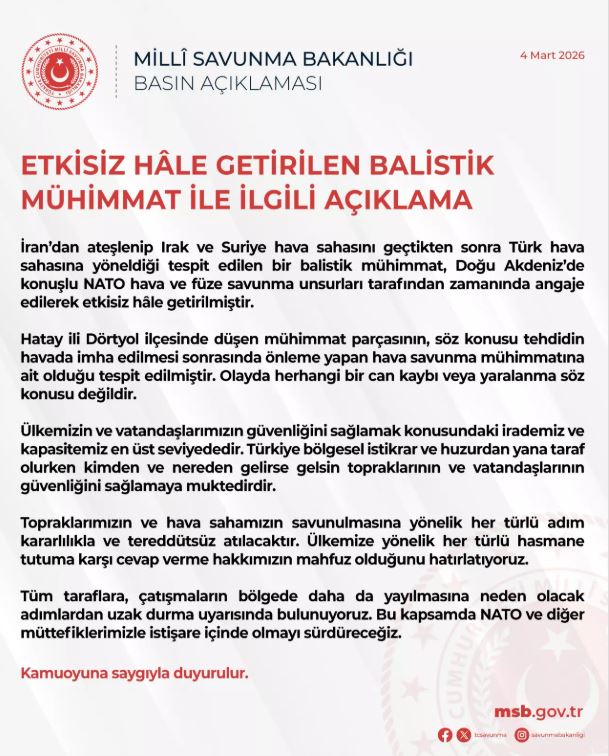 "İran’dan ateşlenip Irak ve Suriye hava sahasını geçtikten sonra Türk hava sahasına yöneldiği tespit edilen bir balistik mühimmat, Doğu Akdeniz’de konuşlu NATO hava ve füze savunma unsurları tarafından zamanında angaje edilerek etkisiz hâle getirilmiştir.