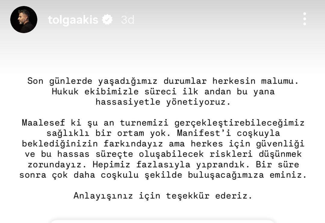 Maalesef ki şu an turnemizi gerçekleştirebileceğimiz sağlıklı bir ortam yok. Manifest’i coşkuyla beklediğinizin farkındayız ama herkes için güvenliği ve bu hassas süreçte oluşabilecek riskleri düşünmek zorundayız. Hepimiz fazlasıyla yıprandık. Bir süre sonra çok daha coşkulu şekilde buluşacağımıza eminiz.