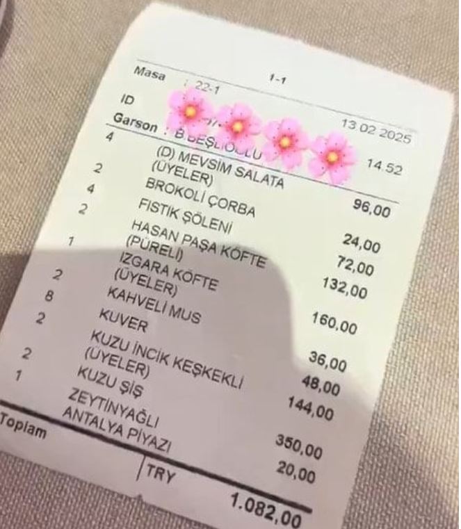 Meclis Lokantası'na öğle yemeğine giden 8 kişilik bir grup, 4 Mevsim Salatası, 2 Brokoli Çorbası, 4 Fıstık Şöleni, 2 Püreli Hasan Paşa Köftesi, 1 Izgara Köfte, 2 Kahveli Mus, 2 Kuzu İncik Keşkekli, 2 Kuzu Şiş, 1 de Zeytinyağlı Antalya Piyazı siparişi verdi. Grupta yer alan bir vatandaş, yedikleri yemeklerin lezzetli olduğunu belirterek, ödedikleri adisyonu paylaştı. Buna göre; hesap 1082 lira gelirken, 8 kişilik garson hizmeti (Kuver) için de kişi başı 6 lira ücret alındı.