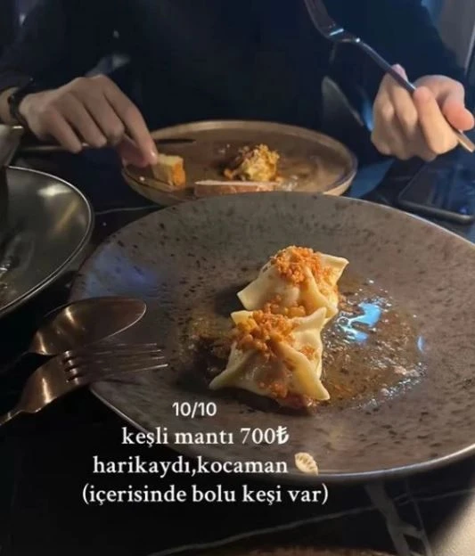 Kullanıcının paylaştığı bilgilere göre, menüde yer alan keşli mantı porsiyonu 700 TL’ye sunuluyor. Tabağın içinde iki büyük parça mantı yer alıyor. En çok dikkat çeken ürünlerden biri ise “Serseri” adlı yemek oldu. Dana bonfile ve kalamarla hazırlanan bu özel tabak, 1550 TL’lik fiyatıyla tartışmaların odağı haline geldi.