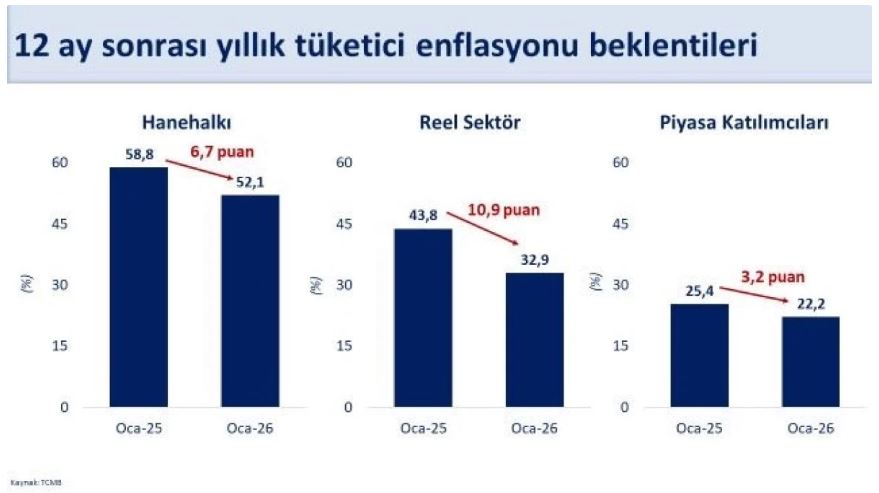 TCMB; ocak ayı, 12 ay sonrası sektörel yıllık enflasyon beklentilerine göre, piyasa katılımcıları için 1,15 puan, reel sektör için 1,90 puan azaldı, hanehalkı için 1,18 puan arttı.