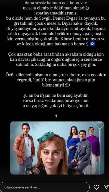 Bozyel yaptığı paylaşımda şu ifadeleri kullandı: "Daha sessiz kalınan çok konu var. Mesela elimizde döküman olmadığı için ispatlayamadıklarımız. Bu dizide hem de Sevgili Demet Evgar'la oynayan bu gri takımlı çocuk mesela. Diyarbakır'daydık. 16 yaşımdaydım, aynı okulda aynı sınıftaydık. Başıma silah dayayarak benimle birlikte olmaya çalışmıştı. İzin vermemiştim çok şükür. Kimse benim minyon ve az kiloda olduğuma bakmasın bence.