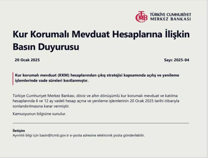"Kur korumalı mevduat (KKM) hesaplarından çıkış stratejisi kapsamında açılış ve yenileme işlemlerinde vade süreleri kısıtlanmıştır.