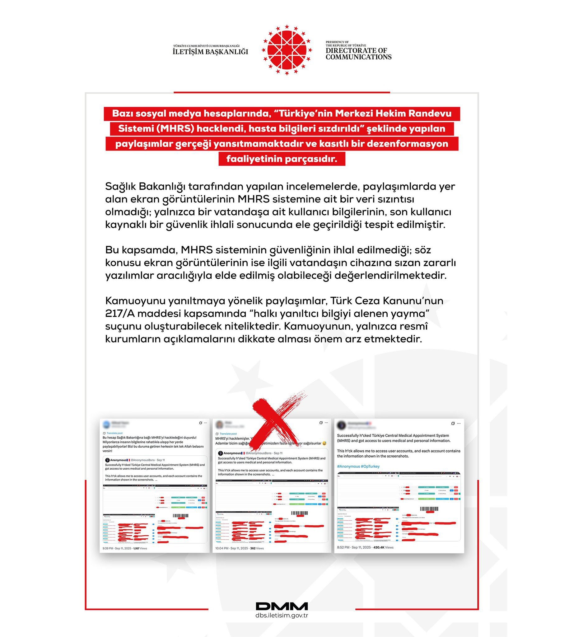 "Sağlık Bakanlığı tarafından yapılan incelemelerde, paylaşımlarda yer alan ekran görüntülerinin MHRS sistemine ait bir veri sızıntısı olmadığı, yalnızca bir vatandaşa ait kullanıcı bilgilerinin, son kullanıcı kaynaklı bir güvenlik ihlali sonucunda ele geçirildiği tespit edilmiştir. Bu kapsamda MHRS sisteminin güvenliğinin ihlal edilmediği, söz konusu ekran görüntülerinin ise ilgili vatandaşın cihazına sızan zararlı yazılımlar aracılığıyla elde edilmiş olabileceği değerlendirilmektedir.