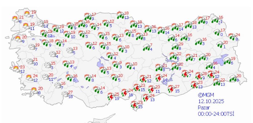 Yapılan tahminlere göre, yurdun kuzey, iç ve batı kesimleri parçalı ve çok bulutlu, Marmara (Çanakkale hariç), İç Anadolu’nun kuzeybatısı, Batı ve Orta Karadeniz, Doğu Karadeniz kıyıları ile Kütahya, Uşak, Afyonkarahisar, Konya, Aksaray, Kırşehir, Yozgat ve Artvin çevreleri yağmur ve sağanak yağışlı, yer yer gök gürültülü sağanak yağışlı olacak.