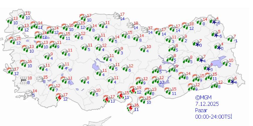 Antalya, Mersin ve Kahramanmaraş çevrelerinde kuvvetli gök gürültülü sağanaklar, Isparta'nın güneyi ile Adana'nın kuzeyinde ise yerel kuvvetli yağışlar öngörülüyor.