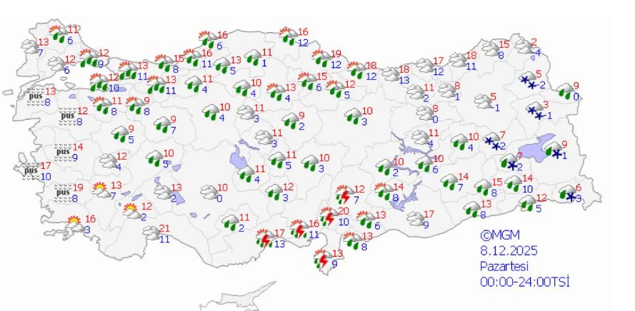 İç Anadolu'da hafif yağmurlar devam ederken, Doğu Anadolu'nun batısında karla karışık yağmur görüleceği tahmin ediliyor.