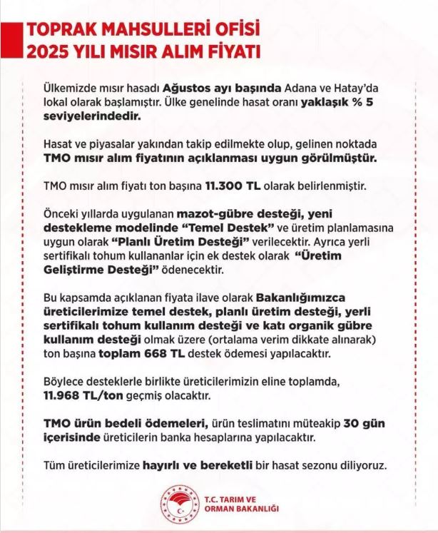 "Ülkemizde mısır hasadı Ağustos ayı başında Adana ve Hatay’da lokal olarak başlamıştır. Ülke genelinde hasat oranı yaklaşık yüzde 5 seviyelerindedir. Hasat ve piyasalar yakından takip edilmekte olup, gelinen noktada Toprak Mahsulleri Ofisi mısır alım fiyatının açıklanması uygun görülmüştür. Toprak Mahsulleri Ofisi mısır alım fiyatı ton başına 11 bin 300 lira olarak belirlenmiştir.
