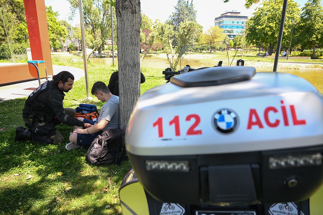 Ankara'nın en yoğun noktalarından biri olan Güvenpark'ta bekleyen motorize ambulans ekibi gelen ihbarın ardından 3 dakika içinde ilk müdahaleyi gerçekleştirmek için Abdi İpekçi Parkı'na ulaştı.