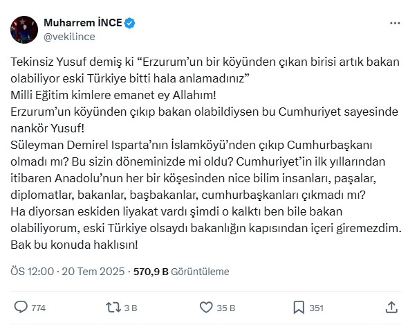 Memleket Partisi'nin kapattıktan sonra CHP'ye geçen Muharrem İnce, Milli Eğitim Bakanı Yusuf Tekin'in, "Erzurum’un bir köyünden çıkan birisi artık bakan olabiliyor eski Türkiye bitti hala anlamadınız" sözlerine cevap verdi.