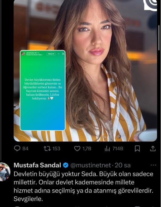 X hesabından Bakan'a cevap veren ünlü şarkıcı, "Devletin büyüğü yoktur Seda. Büyük olan sadece millettir. Onlar devlet kademesinde millete hizmet adına seçilmiş ya da atanmış görevlilerdir. Sevgilerle." dedi.