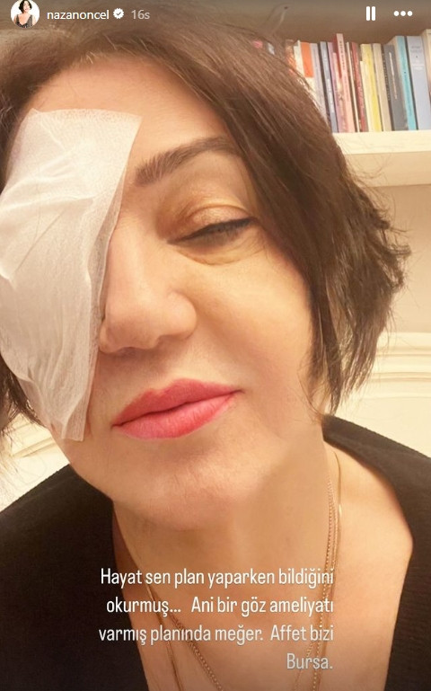 Operasyon sonrası gözü bandajlı halde bir fotoğrafını paylaşan sanatçı, "Hayat sen plan yaparken bildiğini okurmuş. Ani bir göz ameliyatı varmış planında meğer" dedi.
