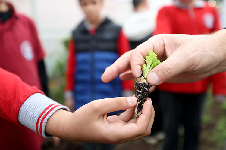 Okul bahçesinde atıl durumdaki alana 50 metrekare sera kuran Erginsoy, öğrencileriyle marul, taze soğan ve taze fasulye üretiyor.