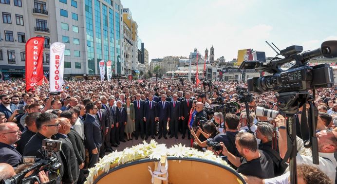 Araç, şu köşeyi dönerken Taksim Meydanı'nı ve sizleri gördüğümdeki duygumu şöyle ifade etmek isterim: Araç buraya döndü, tüm Türkiye dün AK Parti'nin yönlendirdiği talimatlı yargıyla Türkiye'nin kurucu partisine, onun İstanbul İl Başkanlığı'na karşı yapılan bir darbeyi ve bunu 5 bin polisle birlikte gerçekleştirenleri gördü. Eğer yetkinizi AK Parti yargısından alırsanız 5 bin polise ihtiyacınız var. Ama eğer yetkiyi milletten alıyorsanız işte Taksim'e gelirsiniz, sizi 5 bin tane partili karşılar.