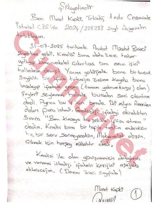 Bugün kuruluşunu kutladığımız AKP'nin MKYK üyeliği dahil, çok sayıda görev yapmış Mücahit Birinci denilen arkadaş gider, Murat Kapki ile konuşur. 31 Temmuz 2025 günü, Kapki'nin önüne 1,5 sayfalık bir ifade tutanağını koymuş. "Bunu imzalayacaksın, milyon dolarlık para vereceksin. Buradan çıkıp gideceksin" demiş.