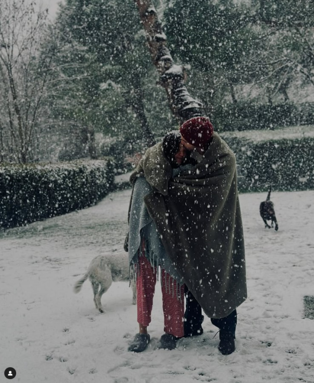Erkek bebek bekleyen çift, sık sık mutlu pozlarını takipçilerinin beğenisine sunuyor. Yıldırım, son olarak eşiyle ve köpekleriyle evlerinin bahçesinde çekilmiş kar pozunu paylaştı.