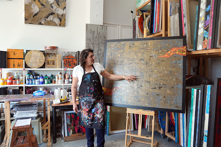 Yasemen Latife Ayvaz, eserlerinde fırça yerine spatula ve akrilik boya ile 22 ayar altın kullandığını dile getirerek, şunları kaydetti: