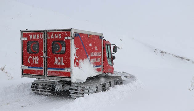 Yolun ulaşıma kapalı olan kısımlarında paletli ambulans kullanan ekipler, en kısa zamanda hastaya ulaşmak için kar, tipi, sis ve zorlu coğrafi şartlarla mücadele ediyor.