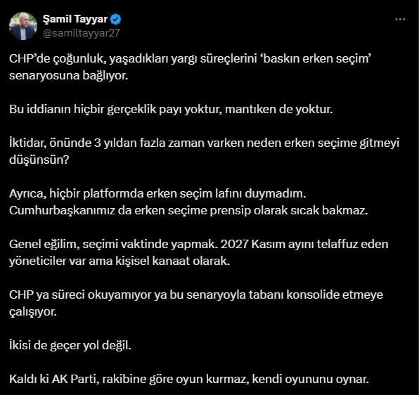 Ancak AK Partili Şamil Tayyar'a göre tüm ekonomik ve siyasi krizlere rağmen, Cumhurbaşkanı ve AK Parti Genel Başkanı Recep Tayyip Erdoğan'ın erken seçim gibi bir düşüncesi yok.