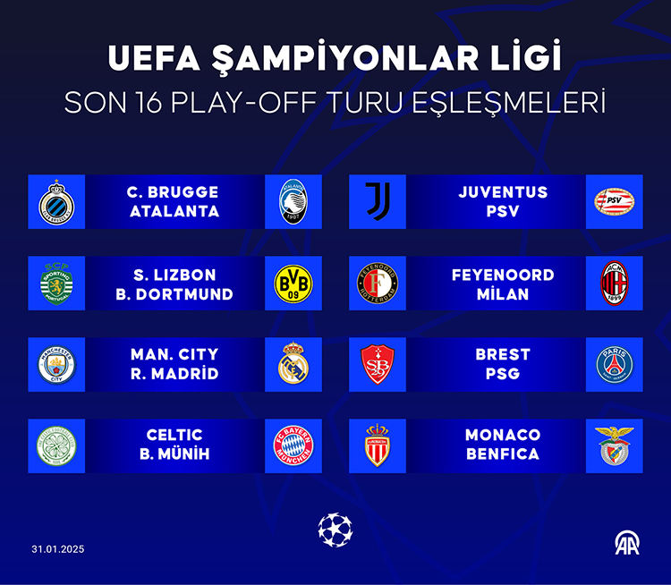 Bu sezon 36 takımlı lig formatına göre düzenlenen Avrupa futbolunun kulüpler düzeyindeki 1 numaralı turnuvasında son 16 play-off turu kura çekimi, İsviçre'nin Nyon kentindeki UEFA Genel Merkezi'nde yapıldı.