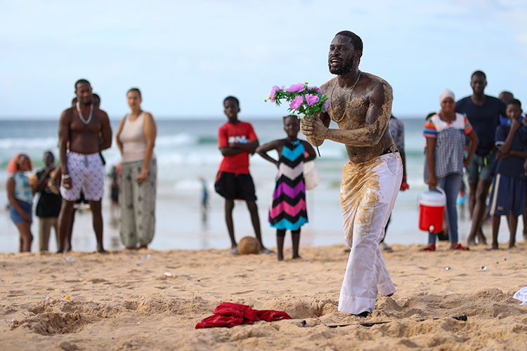 Sanatçı Gueye, Dakar'ın en kalabalık plajlarından Yoff'ta düzenlediği gösteriye bölgede yaşayan Lebu etnik grubuna ait, ruhsal veya psikolojik rahatsızlıkları iyileştirmek amacıyla yapılan "Ndeup" ritüeliyle başladı.