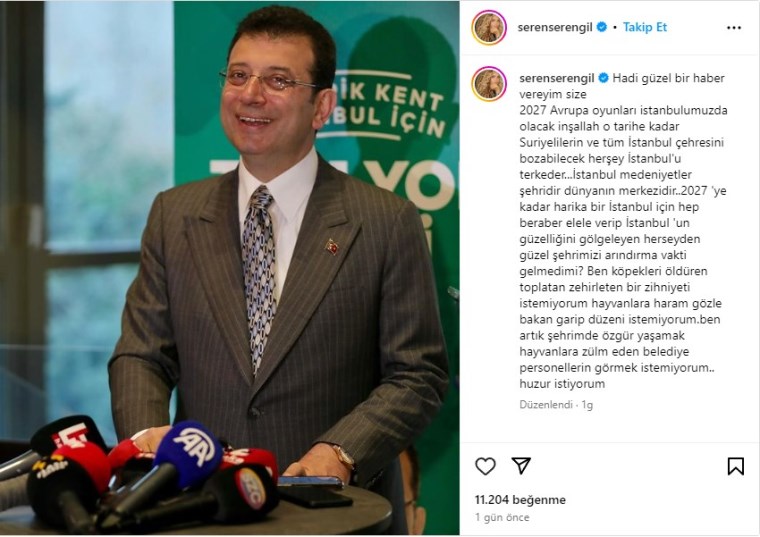 Sosyal medyada paylaşımla dikkat çeken Seren Serengil, CHP'nin İstanbul adayı ve mevcut İstanbul Büyükşehir Belediyesi (İBB) Başkanı Ekrem İmamoğlu'nun bir fotoğrafını paylaşarak şunları söyledi: