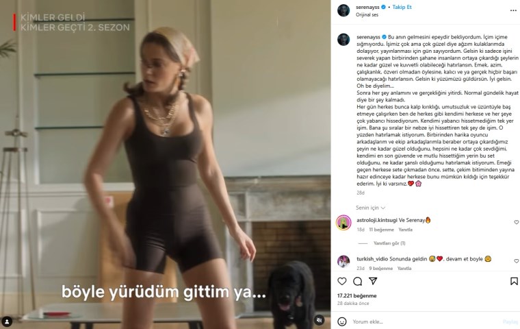 "Her gün herkes bunca kalp kırıklığı, umutsuzluk ve üzüntüyle baş etmeye çalışırken ben de herkes gibi kendimi herkese ve her şeye çok yabancı hissediyorum. Kendimi yabancı hissetmediğim tek yer işim. Bana şu sıralar bir nebze iyi hissettiren tek şey de işim. O yüzden hatırlamak istiyorum. Birbirinden harika oyuncu arkadaşlarım ve ekip arkadaşlarımla beraber ortaya çıkardığımız şeyin ne kadar güzel olduğunu, hepsini ne kadar çok sevdiğimi, kendimi en son güvende ve mutlu hissettiğim yerin bu set olduğunu, ne kadar şanslı olduğumu hatırlamak istiyorum. Emeği geçen herkese sete çıkmadan önce, sette, çekim bitiminden yayına hazır edinceye kadar herkese bunu mümkün kıldığı için teşekkür ederim. İyi ki varsınız."