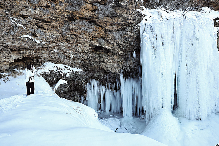 Bazı ziyaretçiler de buzla kaplanan şelaleyi fotoğrafladı.