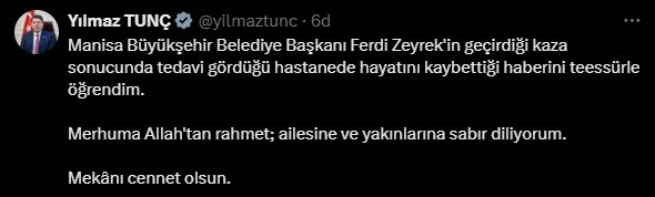 Sağlık Bakanı Kemal Memişoğlu, sosyal medya hesabından yaptığı açıkamada, evinde elektrik akımına kapılarak ağır yaralanan ve 3 gündür yoğun bakımda olan Ferdi Zeyrek'in hayatını kaybettiğini duyurdu.