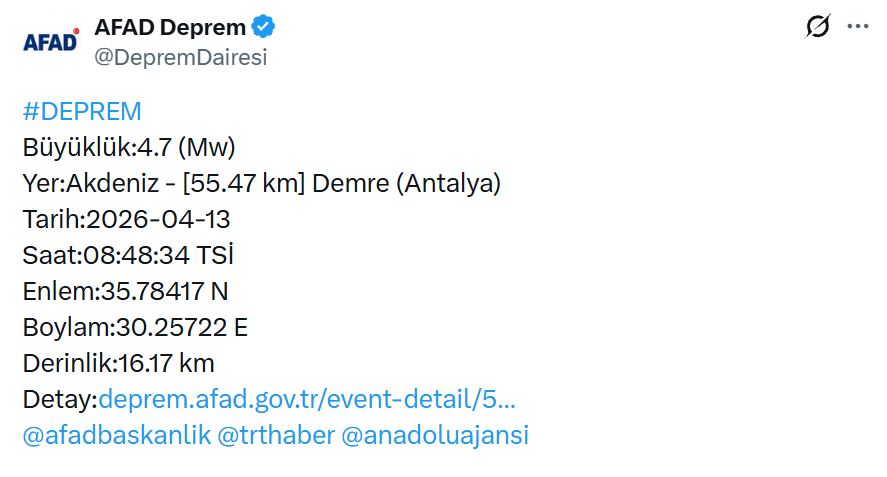 Afet ve Acil Durum Yönetimi Başkanlığının (AFAD) internet sitesinde yer alan bilgiye göre, saat 08.48'de Antalya'nın Demre ilçesinde 4,7 büyüklüğünde sarsıntı kaydedildi.