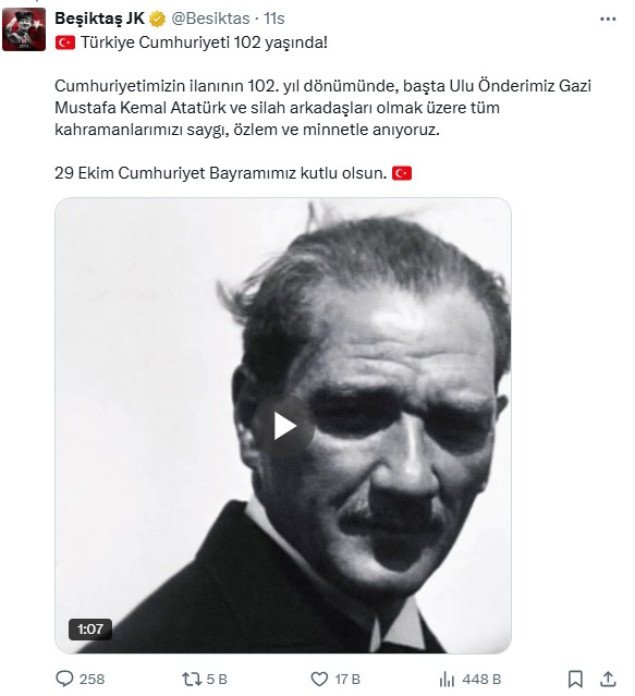 Beşiktaş, Fenerbahçe ve Galatasaray kulüpleri, 29 Ekim Cumhuriyet Bayramı dolayısıyla kutlama mesajı yayımladı.