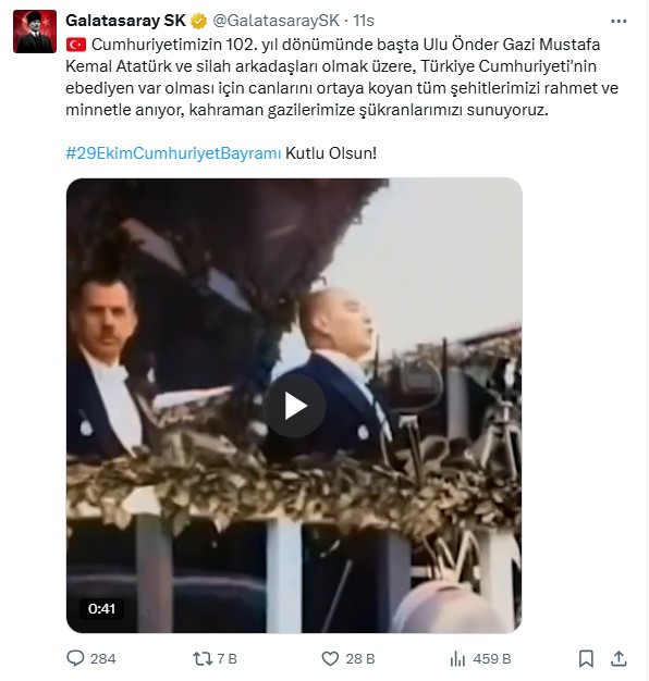 Sarı-kırmızılı kulübün internet sitesinden ise "Cumhuriyet'imizin 102. yıl dönümünde başta Ulu Önder Gazi Mustafa Kemal Atatürk ve silah arkadaşları olmak üzere, Türkiye Cumhuriyeti'nin ebediyen var olması için canlarını ortaya koyan tüm şehitlerimizi rahmet ve minnetle anıyor, kahraman gazilerimize şükranlarımızı sunuyoruz. 29 Ekim Cumhuriyet Bayramı'mız kutlu olsun." mesajı yayımlandı.