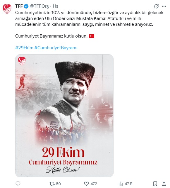 "Cumhuriyeti'mizin 102. kuruluş yıl dönümünü, milletçe birlik ve beraberlik içinde kutluyoruz. Gazi Mustafa Kemal Atatürk'ün önderliğinde, büyük fedakarlıklar ve destansı bir mücadele sonucunda kurulmuş, milletimizin bağımsızlık ve özgürlük iradesinin en yüce simgesi Cumhuriyet'imiz, sadece bir yönetim şekli değil, aynı zamanda eşitliğin, adaletin ve çağdaş medeniyet hedefine ulaşma azminin de güvencesidir. Türkiye Futbol Federasyonu olarak bizler de Cumhuriyeti'mizle yaşıt olmanın gururuyla ve onun değerlerine sahip çıkarak; milletimizin ortak duygularını pekiştiren, farklılıklarımızı zenginliğe dönüştüren futbolu ülkemizin her köşesine yaymaya devam ediyoruz. Başarılı sporcular yetiştirme ve uluslararası arenada bayrağımızı gururla dalgalandırma hedefiyle çalışmalarımızı sürdürüyoruz. Bu anlamlı günde, başta Cumhuriyet'imizin kurucusu Gazi Mustafa Kemal Atatürk ve silah arkadaşları olmak üzere, tüm şehit ve gazilerimizi saygı, rahmet ve minnetle anıyoruz. İlelebet payidar kalacak Cumhuriyetimizin 102. yılı ve 29 Ekim Cumhuriyet Bayramımız kutlu olsun."